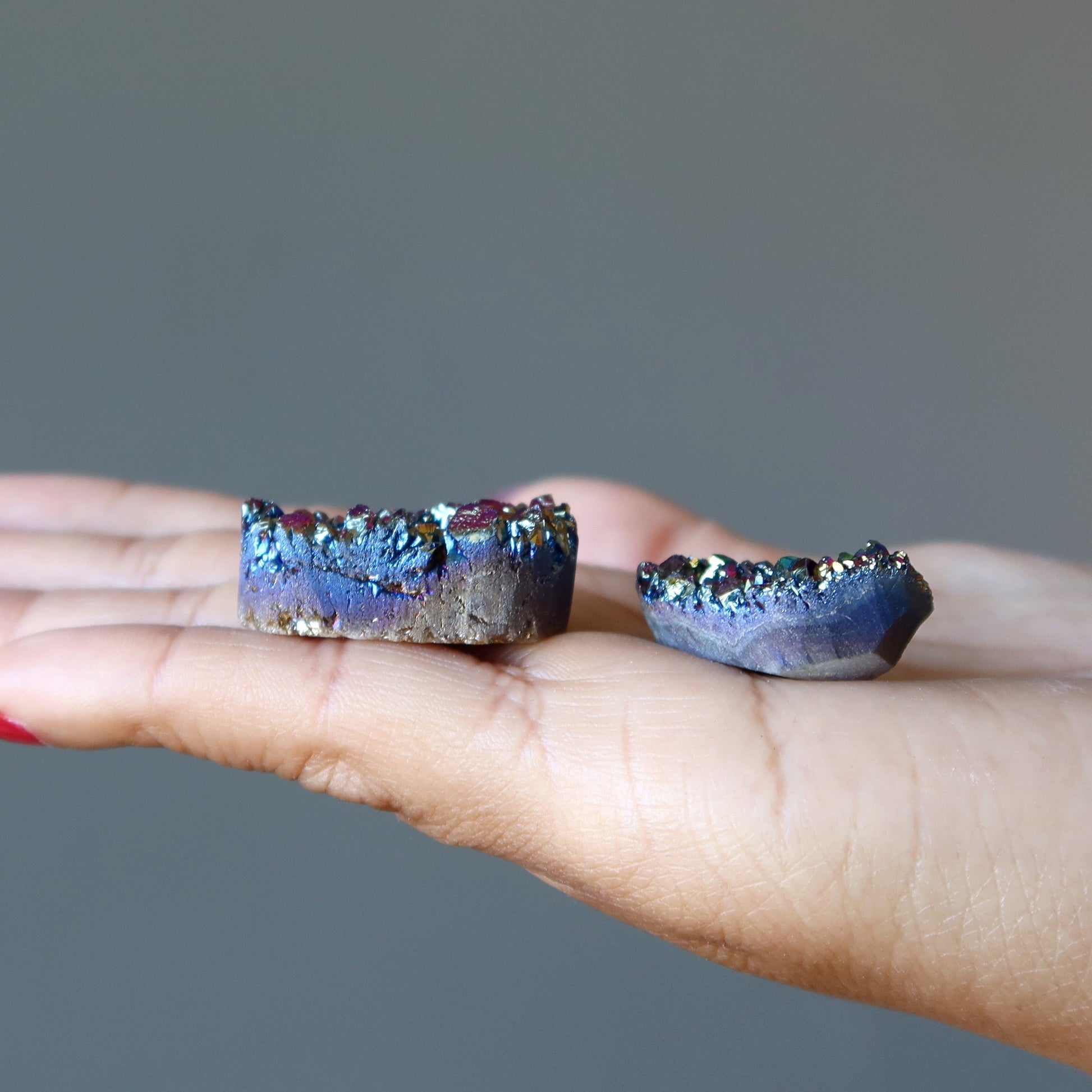 These Rainbow Aura Quartz clusters are sure to spark a smile! Coated with shiny Titanium, they are left in crystal form on the front and flattened in the back. Use your positive-energy stone as a jewelry cabochon or a healing treasure as-is. Whatever makes you happy!