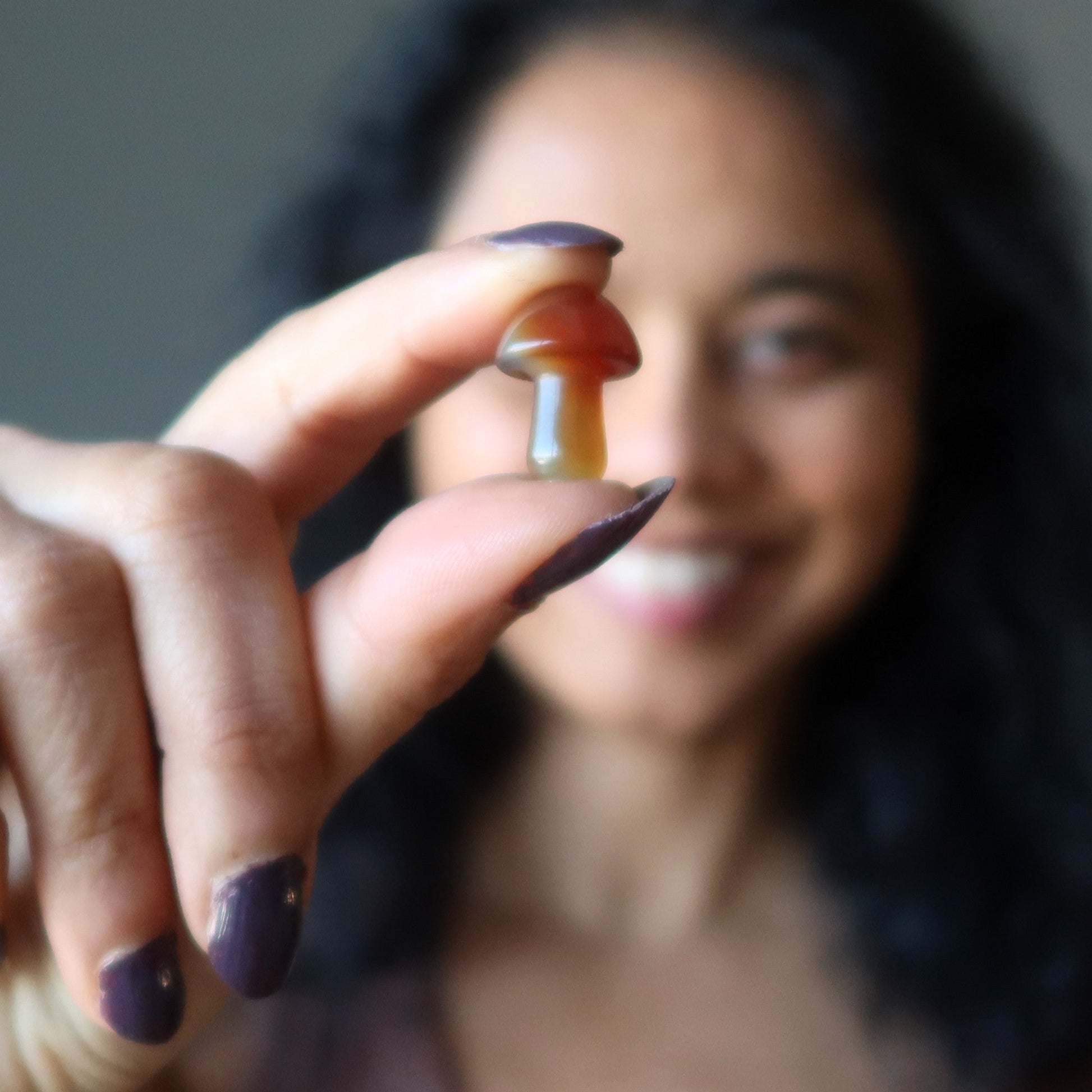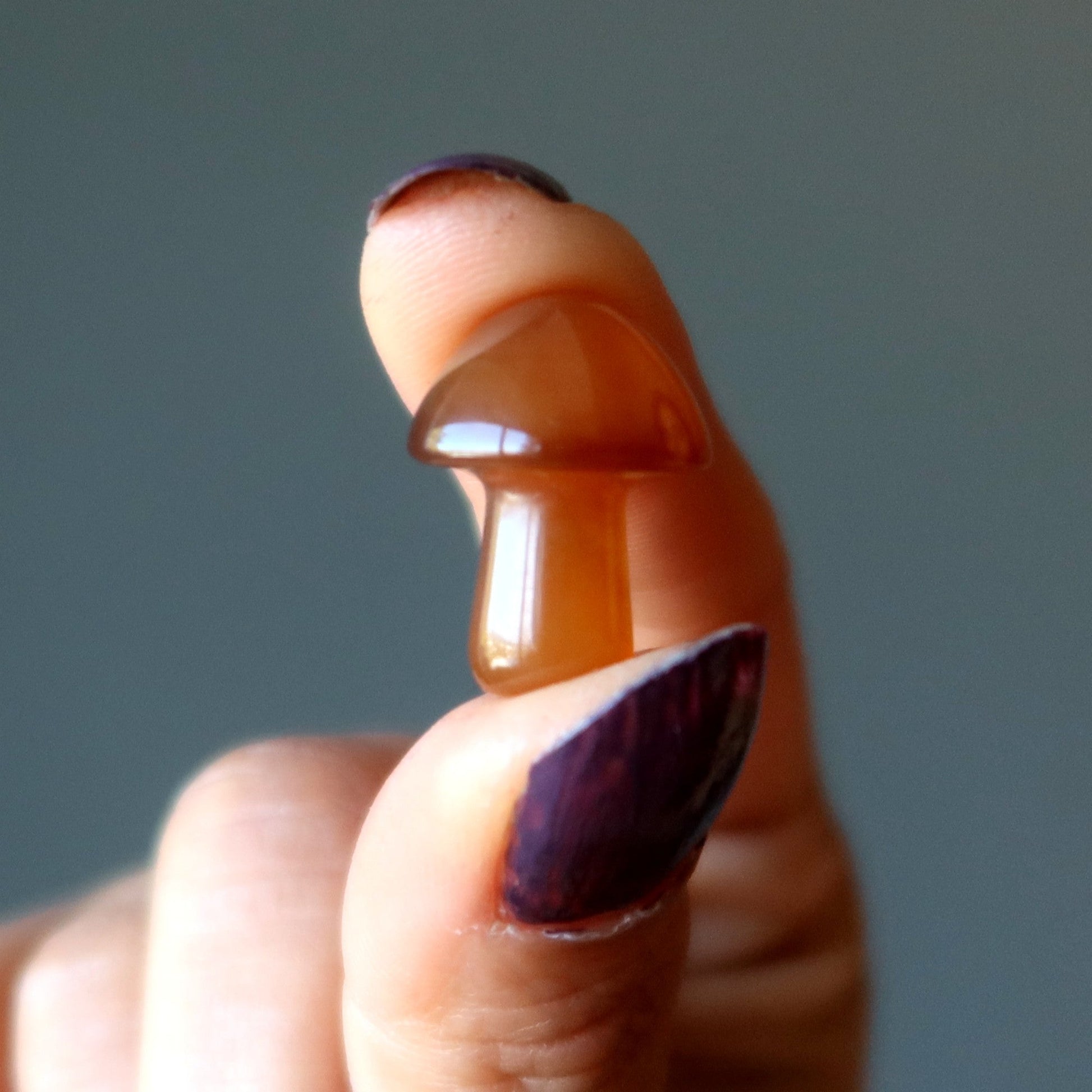 More Your new mushroom is polished from natural and heated Carnelian. This is a translucent reddish-orange stone with natural bands and patterns. The domed stone can stand on its own. Each stone is unique.