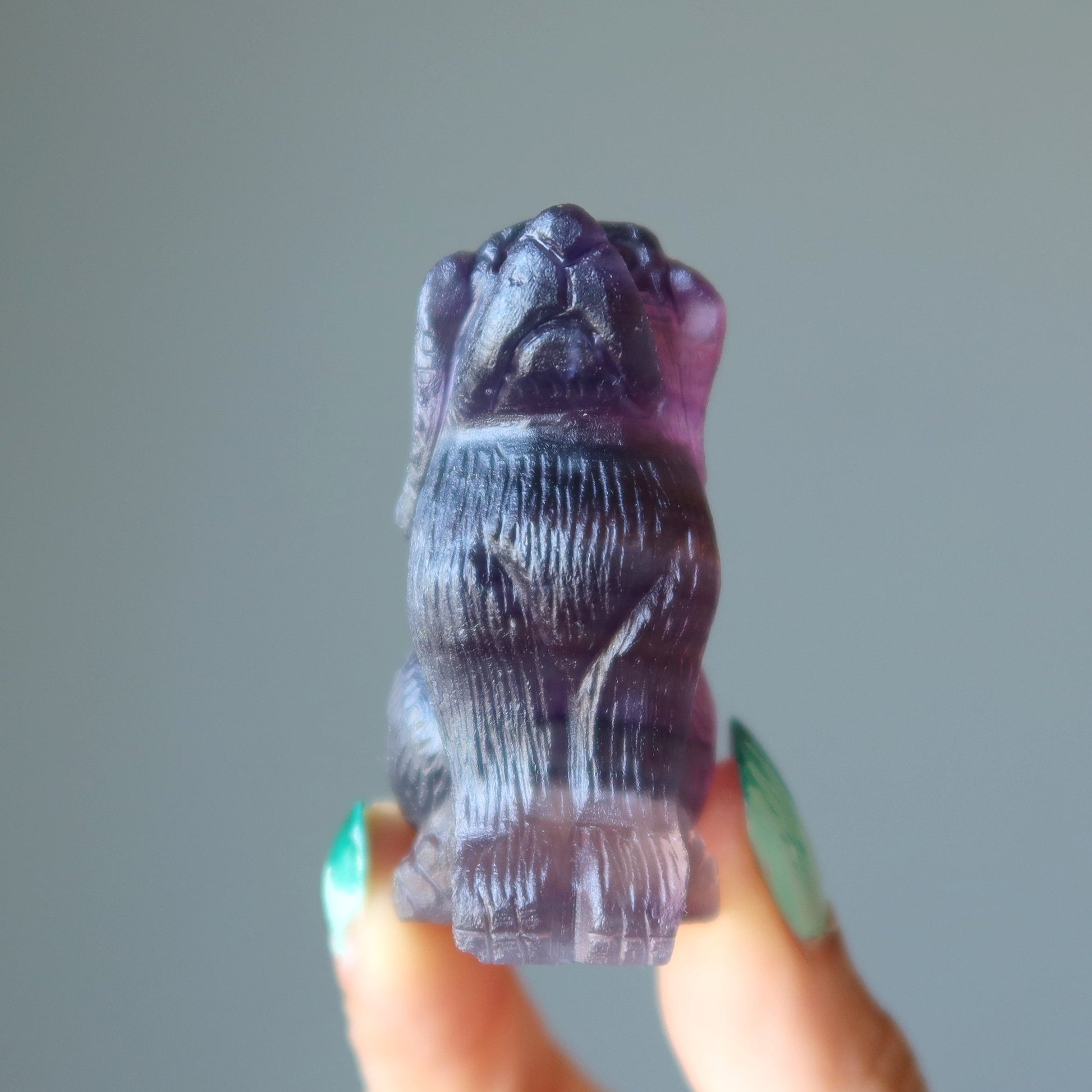 Your new figurine is carved from natural and untreated Fluorite. This is a translucent green stone with spots of purple. The figurine can stand on its own. This is an exquisitely detailed carving of a sitting canine. Each stone is unique.