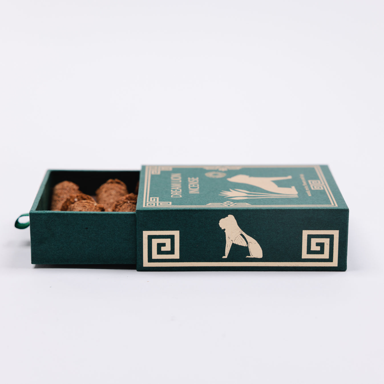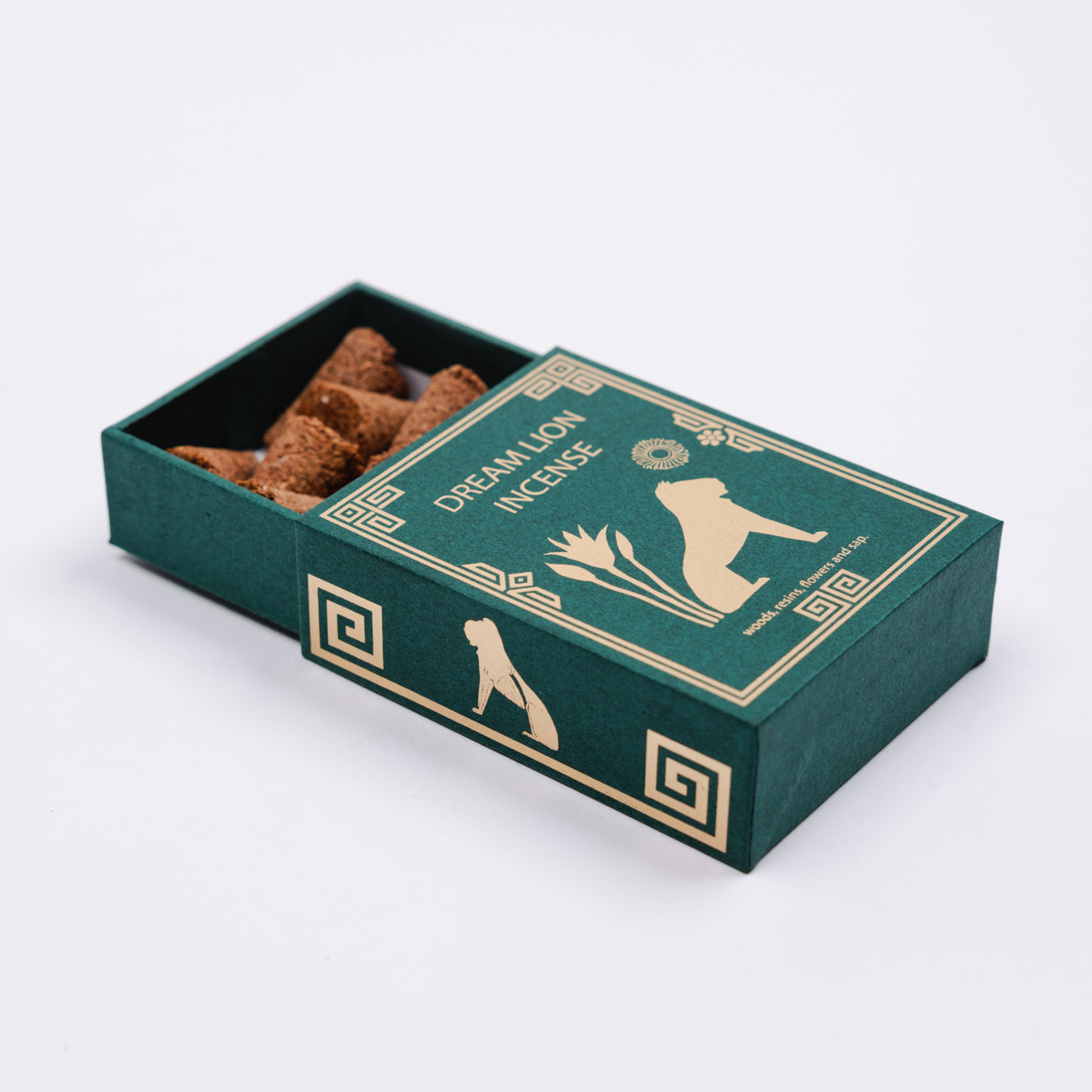 (((Dream lion incense))) Green box is made of white dessert sage, Mayan copal resin, and blended with sandal wood and pinyon wood. An earthy and uplifting purifying scent.