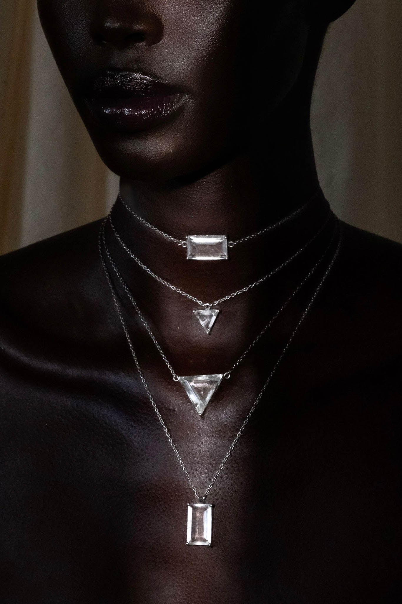 • A jagged constellation of natural striated crystal set in solid sterling silver and hanging from a whisper thin chain