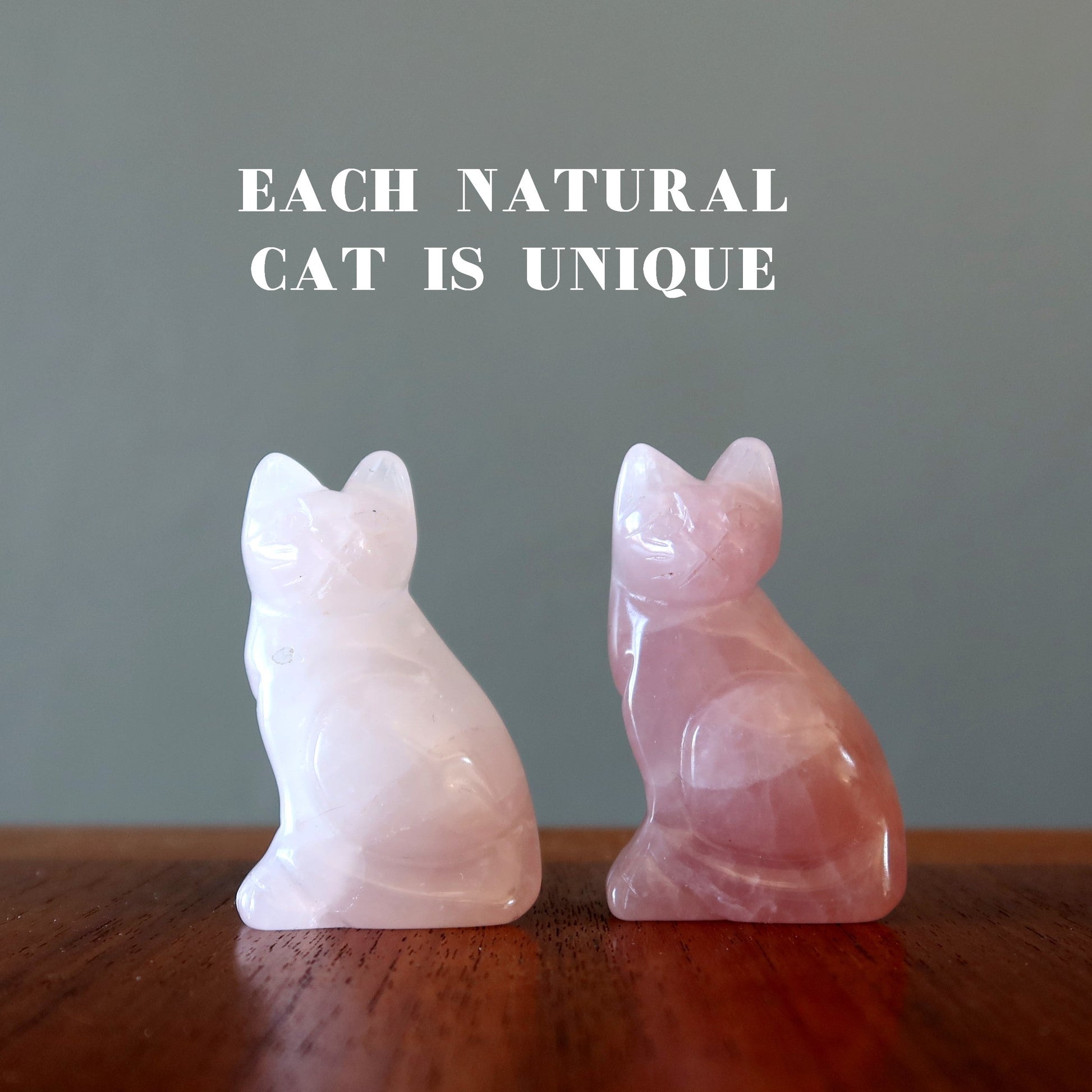 Your new figurine features a natural and untreated Rose Quartz. This is a translucent pink stone with white inclusions. Each cat is unique.