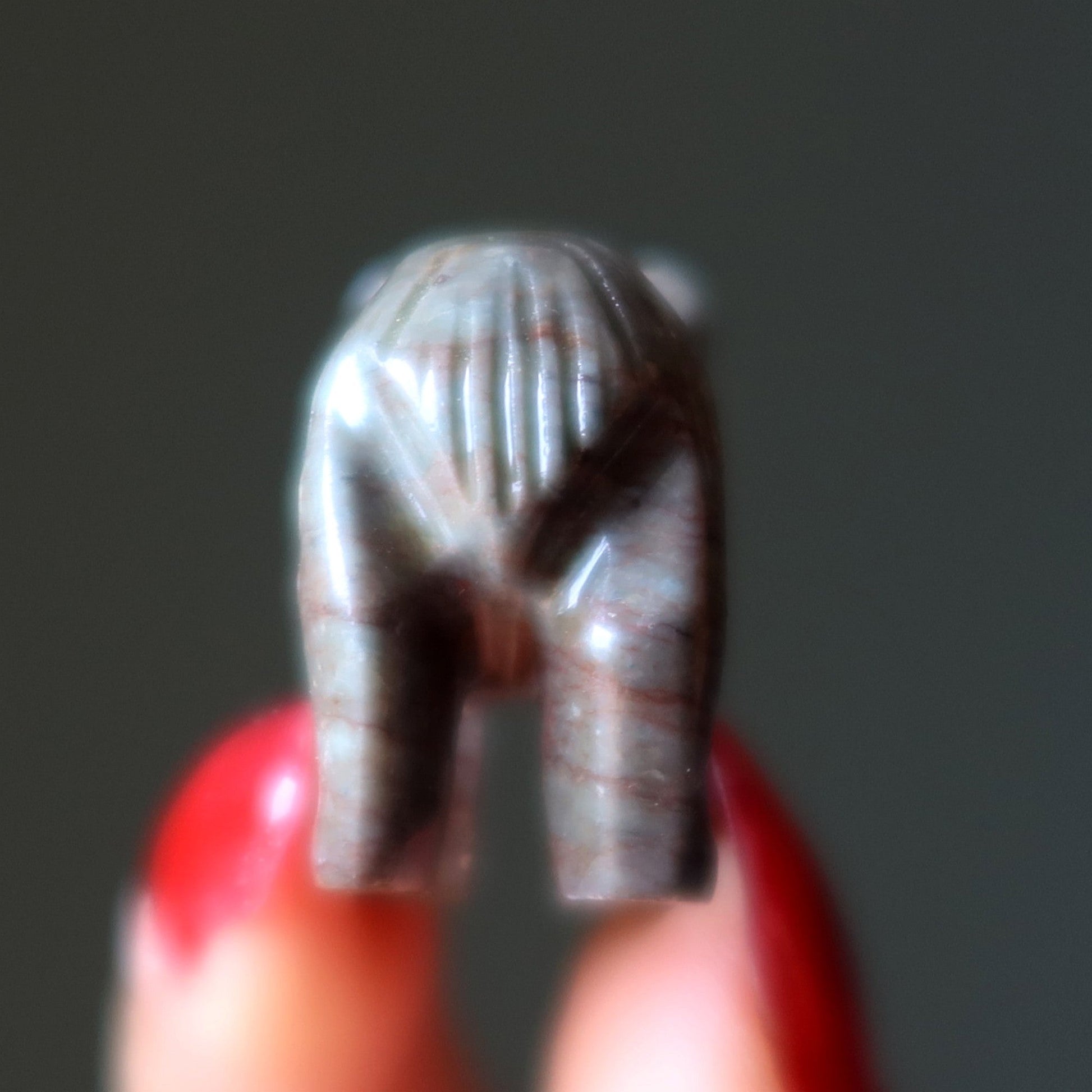 Your new bear is carved from natural and untreated Soapstone. This is a brown stone with red veins and green set eyes. May show organic dips, divots, craters, inclusions, and veins. Each stone is unique.